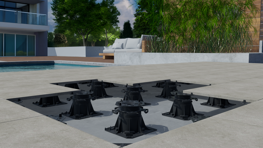 EVOPRO Stelzlager mit Doppelten Verstellsystem: Die EVOPRO Unterkonstruktion für Doppelböden im Aussenbereich stellt die innovativste und präziseste Lösung für die Installation von Doppelbodensystemen dar. Sie ist die ideale Wahl für Terrassen, Poolränder, Gartenpflasterungen, Restaurant-Innenhöfe, öffentliche Räume und Gewerbeflächen.